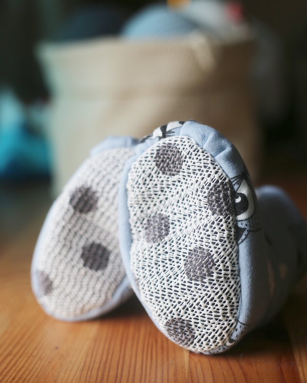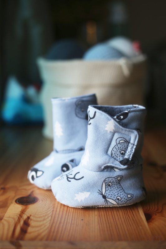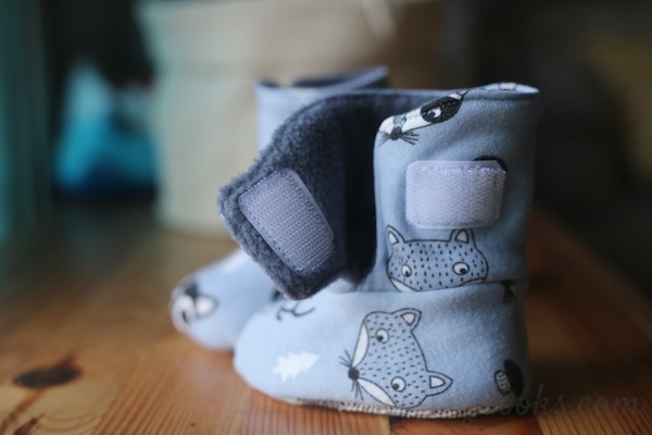 It is quite hard to get a wriggly baby into a pair of boots. So I modified the pattern to form a side enclosure. The horizontal placement of the velcro is deliberate as it allows me to adjust the tightness of the opening.