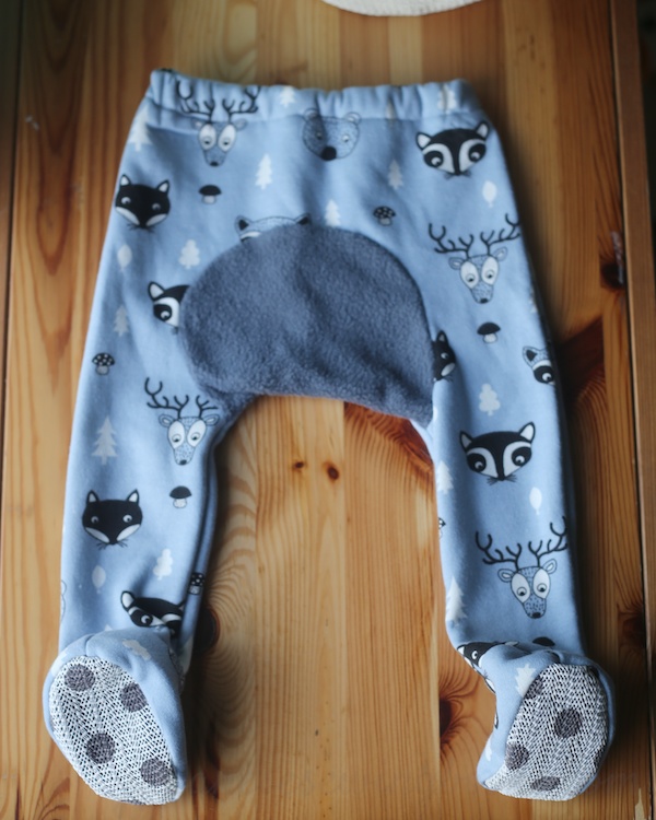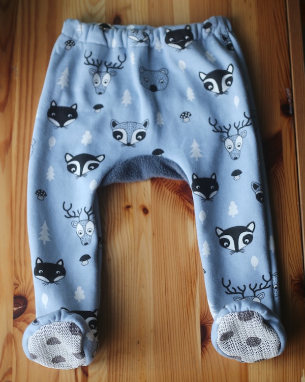 I also made two pairs of monkey pants! One with the cute animal print as the main fabric, and the other with the navy fleece as the main fabric.